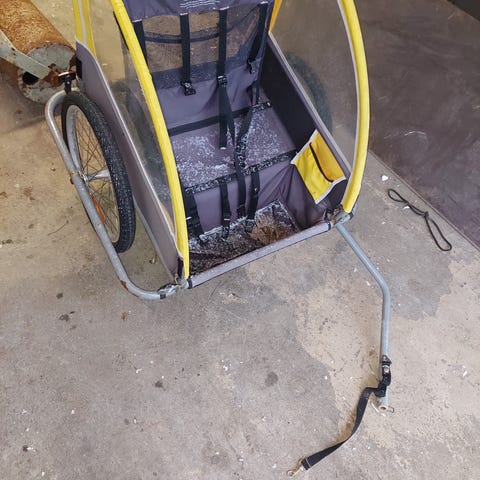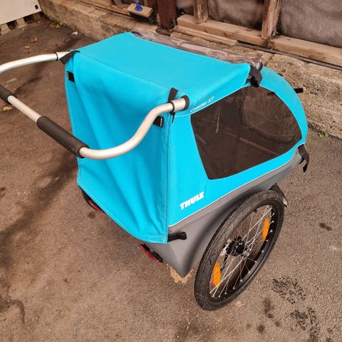 Kan ta av styrestang. Brukt til ett barn.