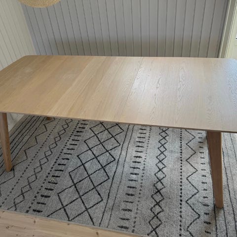 Solid bord i industriell stil med bordplate i heltre eik og ben i metall. Vi har behandlet bordflaten med hvitpigmentert olje for benkeplate, for beskyttelse og et lysere uttrykk. Kan slipes ned og oljes på nytt hvis man vil få en mer strøken benkeplate. Følger med to ileggsplater slik at jordet kan forlenges med 1m. Vi har alltid hatt duk når vi har brukt dem, så de er ikke behandlet av oss, men har original overflate. Bordet er tungt, og må enten bæres ut via terrasse eller skru av bordplate fra beina.