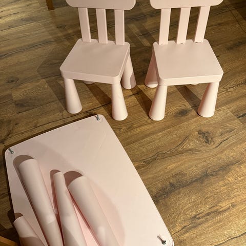 IKEA barnemøbel hvitt bord med firkantet design. Bordet har en enkel og funksjonell konstruksjon med fire ben. Overflaten har mindre skader som merker eller riper.