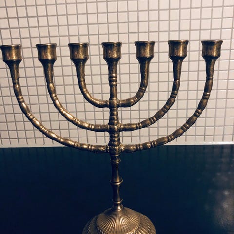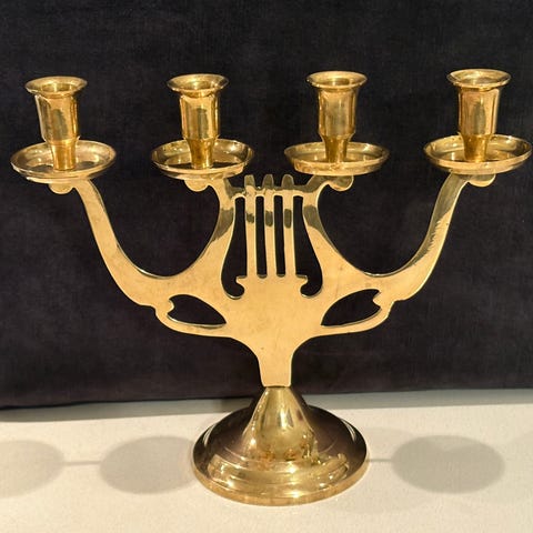 Messing lysestake med syv armer. Lysestaken har en oktagonal base og en klassisk design. Egnet for plassering på bord eller i vinduskarm for dekorativ belysning.
