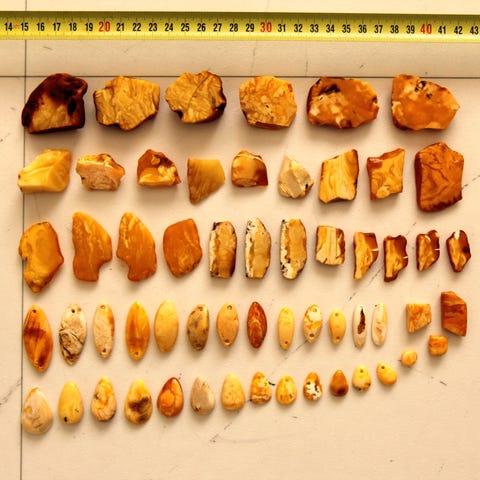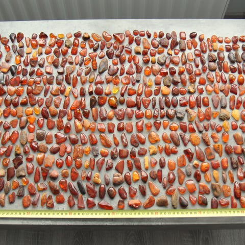 A grade consists mostly of opaque raw amber pieces, rich in egg yolk, caramel and honey colours.