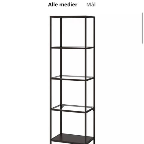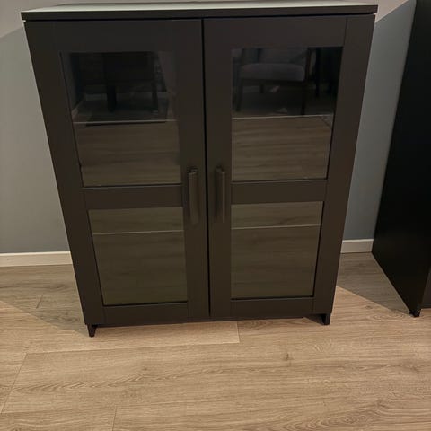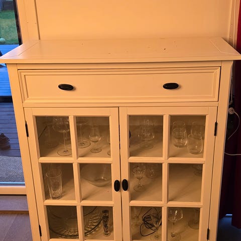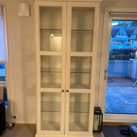 Et Vitrineskap med to glassdører og 7 hyller. Du kan fjerne gardinen. Jeg satte det inn.