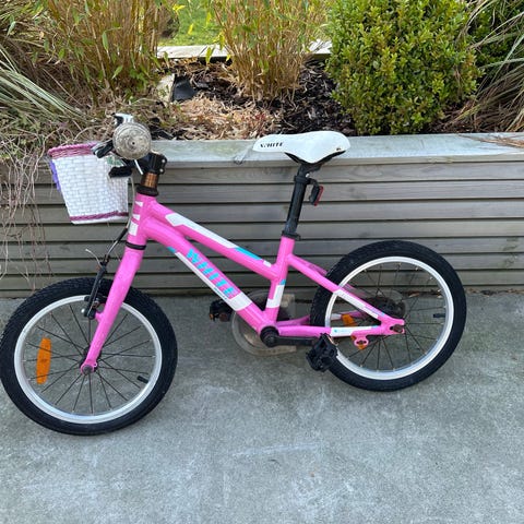 barnesykkel med 12 tommers hjul, i rosa og hvit farge. Sykkelen har støttehjul og et sete tilpasset barn.