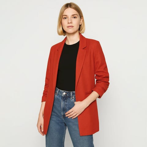 Usikker på hva du skal ha på deg? Sleng på deg en blazer. Denne blazeren er din stilige go-to. Selv når du bruker den over en ensfarget T-skjorte, tilfører blazeren alltid sin egen eleganse og stil. Style med en jeans med wide fit og høye hæler for en oppgradert hverdagslook. Omvendt krage, forlommer - polyesterfôr for en behagelig følelse - Passform : Loose fit