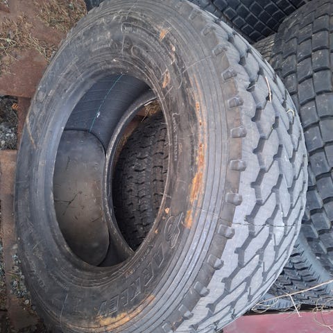 Har ett 18.4-38 dekk med noen rifter og sprekker. Det er ikke sprekt helt igjennom, så dette bør kunne brukes på en gammel traktor.