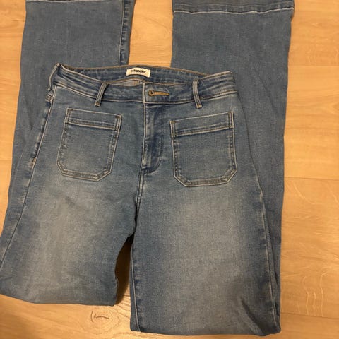 Wrangler Flare jeans i svart denim for kvinner. Størrelse w26/L32. Jeansene har en utsvingt benmodell (flare) og er laget av denimmateriale.