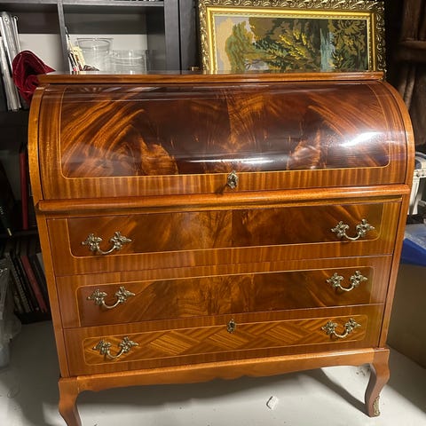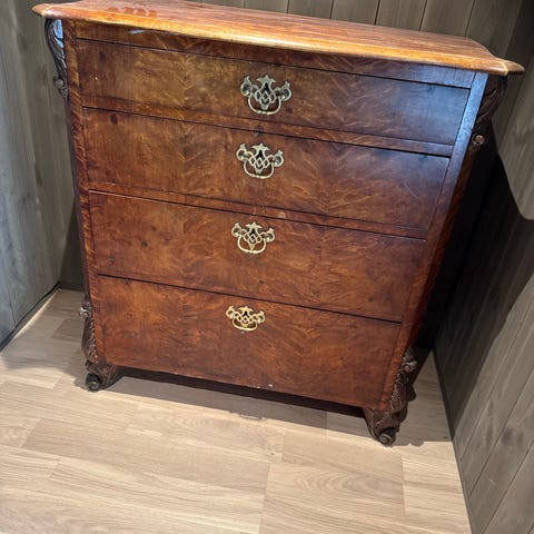 Flott antikt skap i flammebjørk. 5 skuffer som glir lett og rommer mye. Holdt pent.