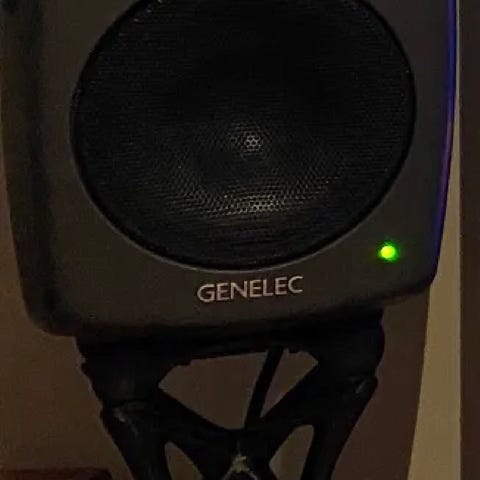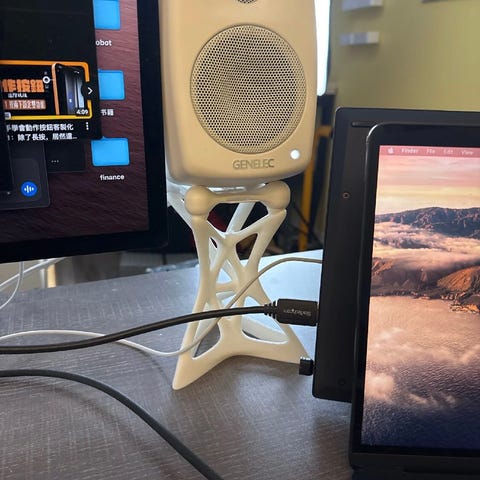 Genelec høyttalerstativ laget av svart plastmateriale. Designet for å støtte høyttalere og forbedre lydplassering. kan brukes på skrivebord eller andre flater.