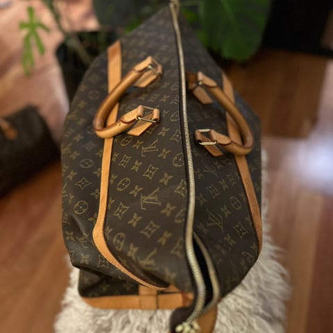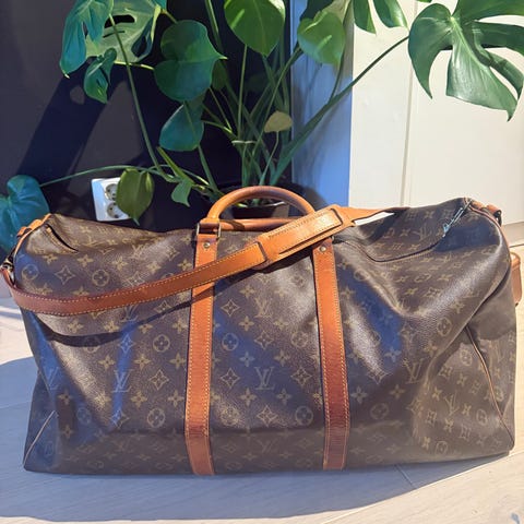 Louis Vuitton Keepall Bandoulière 45 bag i lærmateriale, designet for unisex bruk. Vesken har en størrelse på 45 cm og inkluderer håndtak og skulderrem for bærekomfort. Kjøpt for 13600kr fra vintage.no og ønsker og selge for 7000 fastpris, brukt bare en gang, alt følger med kvittering, kan hentes i Oslo eller kan sendes