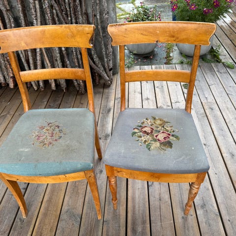 To pent brukte spisestuestoler i ubehandlet furu. Polstring og trekk uten synlig slitasje.