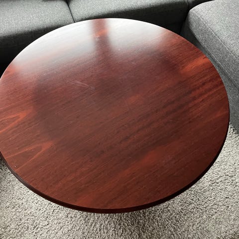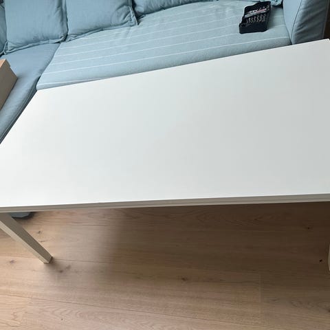 Pen og enkelt sofabord. Hvit bordplate med enkelte bruksmerker, trefargede ben.