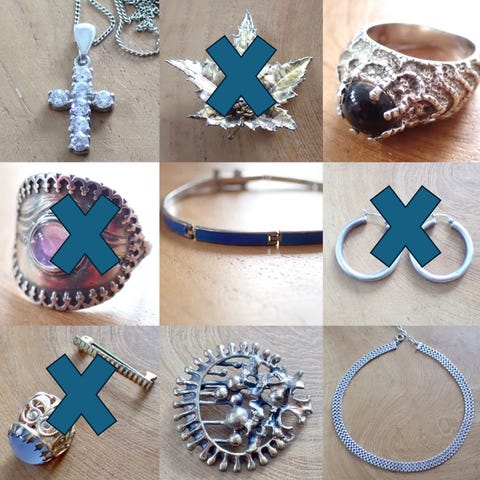 Armbånd, 3 stk. tom esker, og annet.
