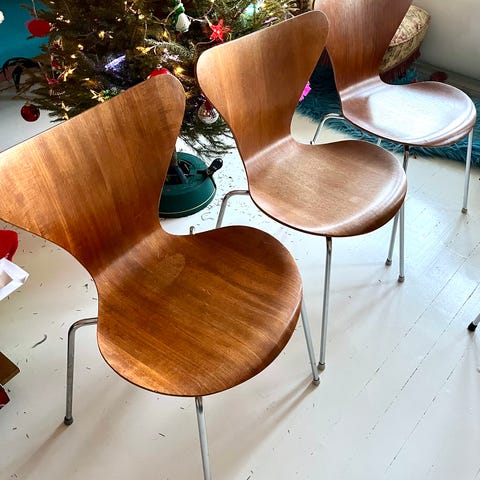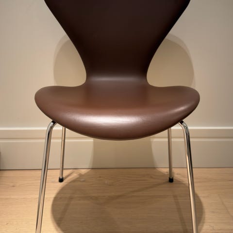 Fritz Hansen «look-a-like» i sort/brunt tre og understell i krom. Har bruksmerker, men er fortsatt fine og stabile. Selges samlet for 500kr