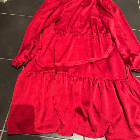 Holly & Whyte festkjole i størrelse M. Kjolen er rosa og har paljettbesetning. Den har lange ermer med elastiske mansjetter og knyting i midjen. Passer til kvinner.