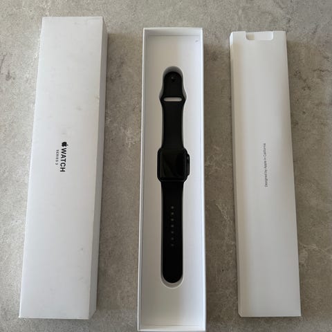 Apple Watch Series 3 smartklokke med mørk grå/svart reim og svart urskive. Enheten har berøringsskjerm og innebygd pulsmåler. Egnet for daglig bruk og treningsaktiviteter.