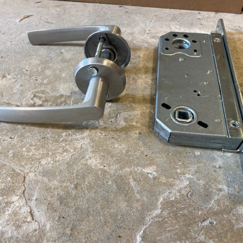 Assa Abloy låskasse med tilbehør inkludert sylinder, nøkler, og tilhørende beslag. Produktet er laget i metall og egnet for dørmontering.