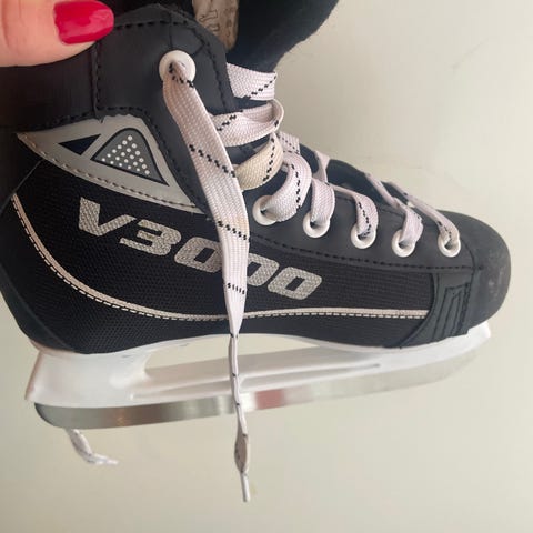 V3000 Ishockeyskøyter for barn i størrelse 31. Skøytene er designet for ishockey og har hvite skøyteblader og svart overdel. Egnet for barn som spiller ishockey eller som ønsker å bruke skøyter til fritidsaktiviteter på is.