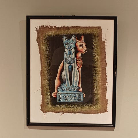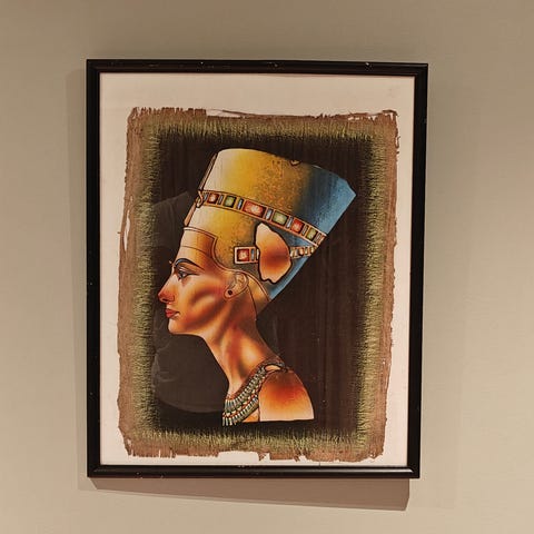 Håndmalt på papyrus bredde 57cm og høyde 77cm.