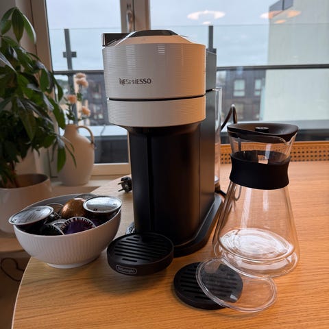 Nespresso Vertuo kaffemaskin i svart farge. Kompakt design for enkel bruk og plassbesparelse. Egnet for hjemme- eller kontorbruk.