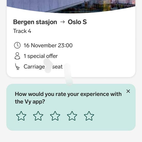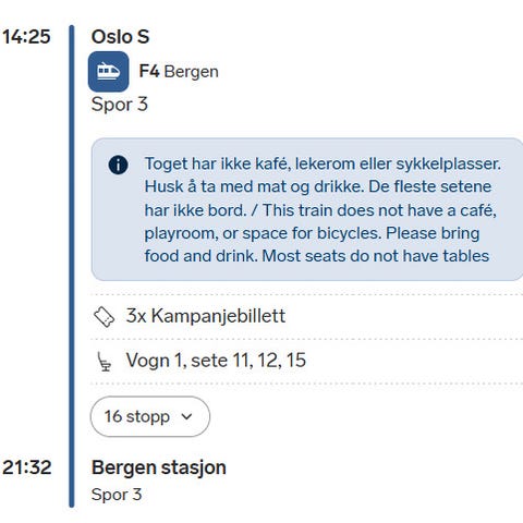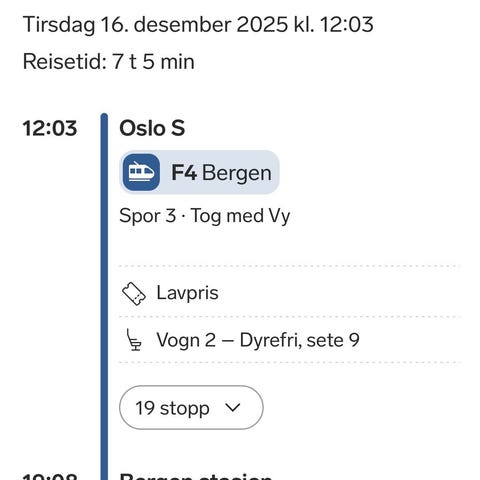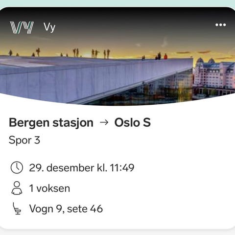 Vy togbillett fra Bergen stasjon til Skoppum stasjon, men stopper både i Oslo S og Drammen, med avgang 26. desember 2025 kl. 23:01. Selges billig ❤️