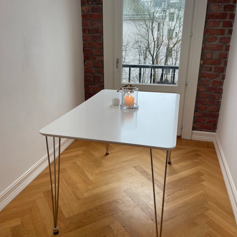 Pent brukt spisebord til salgs. Tre-ben og hvit overflate, kun få bruksmerker i bordplaten men eller velholdt.