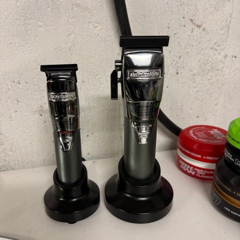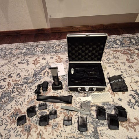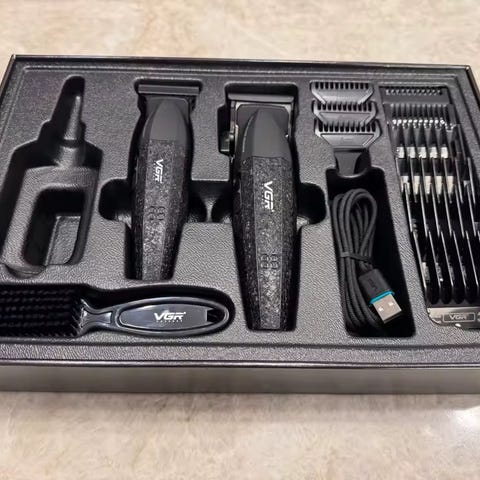 JRL Ghost1 profesjonell hårklippersett med to hvite hårklippere, inkluderer flere kamtilbehør, lader, rengjøringsbørste og bruksanvisninger. Egnet for presisjonsklipping og trimming.