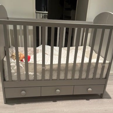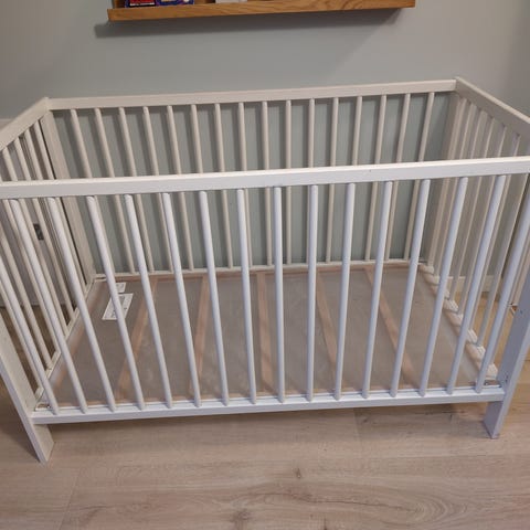IKEA Sprinkelseng barneseng i hvit farge. Laget i materialer egnet for barn, med mål som passer for små barn. Egnet for bruk som barneseng med sikkerhetsrekkverk. Madrass inkludert. Medfølger uro fra Tiny Love om ønskelig.