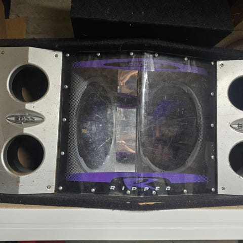 JBL GT-BassPro12 subwoofer med innebygd forsterker. Kabinett i svart stoffmateriale, designet for bilbruk. Inneholder en 12-tommers subwoofer og forsterker med flere tilkoblingsmuligheter og justeringsknapper for lydinnstillinger.