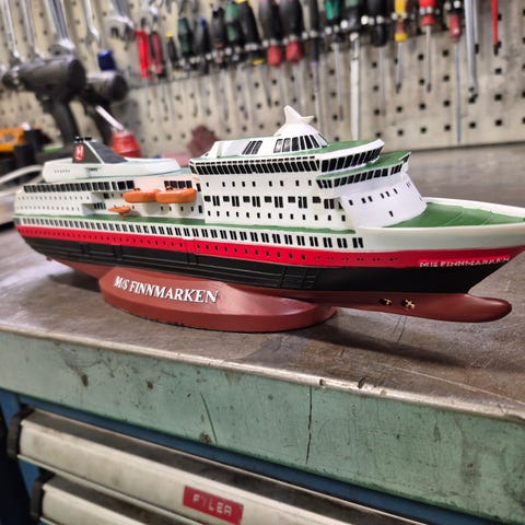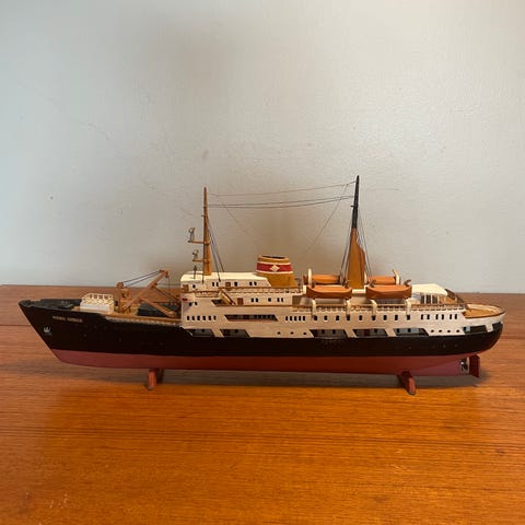 Hurtigruten Midnatsol, gammelt, håndlaget modellskip i tre.