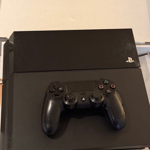 Sony Playstation 4 spillkonsoll med to trådløse kontrollere. Konsollen har et svart design og støtter et bredt utvalg av spill for hjemmeunderholdning.