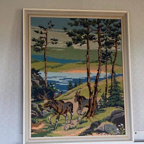 elg, elgmotiv, korssting, broderi, gobelin, håndarbeid, vintage, retro, hytteinteriør, naturmotiv, veggbilde