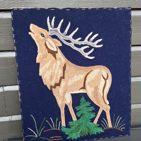 Stort og dekorativt brodert bilde i korssting med klassisk nordisk elgmotiv. Et populært håndarbeidsmotiv fra ca. 1970–90-tallet.