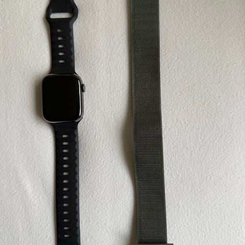 Apple Watch Series 7 smartklokke med hvit silikonrem. Produktet har en rektangulær skjerm og er designet for bruk på håndleddet. Passer for brukere som ønsker en smartklokke med moderne funksjoner og komfortabelt armbånd.