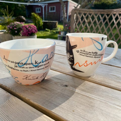 2 pene store lilla kopper fra Modern House. Tekopper er lilla utenpå og hvite inni med påskriften: