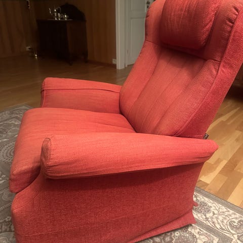 1 stk 3 seter, og 1 stk sjeselong gies bort. 2 velbrukte sofaer i skinn, som er både gode og sitte i, og sove på. Slitt skinn på den ene puta i sjeselongen, se bilde.