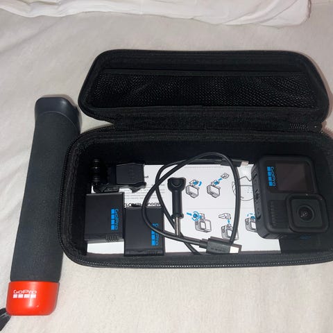 GoPro actionkamera med flere batterier, beskyttelsesramme, festeutstyr og oppbevaringsboks. Kameraet er designet for å fange video og bilder i ulike miljøer og aktiviteter.