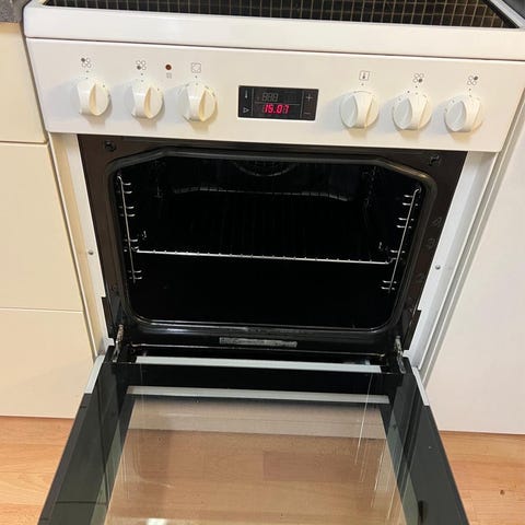 Gorenje keramisk komfyr med keramisk kokeplate. Komfyren har ovnsrom med flere riller for justering av stekebrett. Hvitt kabinett med enkelte bruksmerker. Egnet for matlaging og baking.