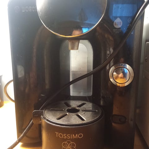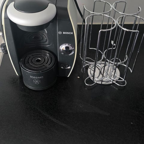 Godt brukt tassimo kapselmaskin med kapselstativ. Kaffekapsler i bildet kan følge med, men de er utgått på dato 24.08.2022.