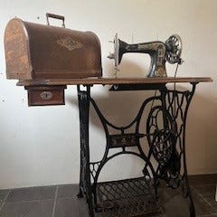 Maskinen er sort med gullstaffering og fungerer med gammeldags fotpedal.