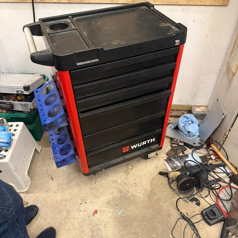 Kraftig verktøyvogn med høy belastningskapasitet, for større verktøy og mindre maskiner. Vognen har et låsbart lokk som kan festes i åpen posisjon. Ett håndtak på hver kortside og gode hjul gjør at vognen er enkel å flytte.