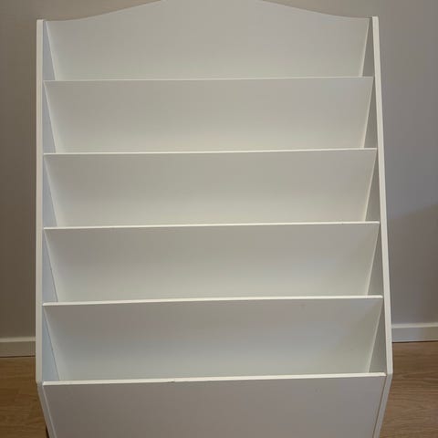 Jollyroom barnebokhylle i hvit farge. Designet for oppbevaring av barnebøker med flere skrå hyller for enkel tilgang. Laget i tremateriale. Passer for barnerom.
