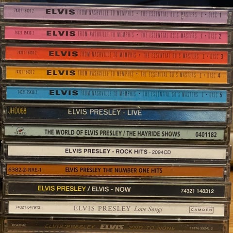 Samling av Elvis Presley vinylplater med ulike albumcover, inkludert liveopptredener og studioinnspillinger. Platene har varierende design og er egnet for samlere og musikkinteresserte.