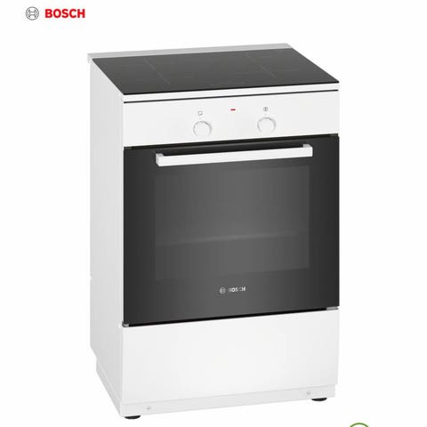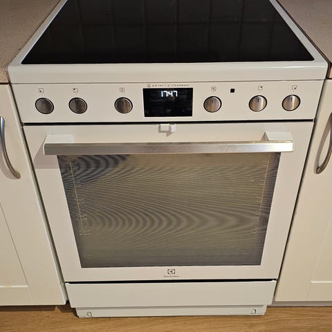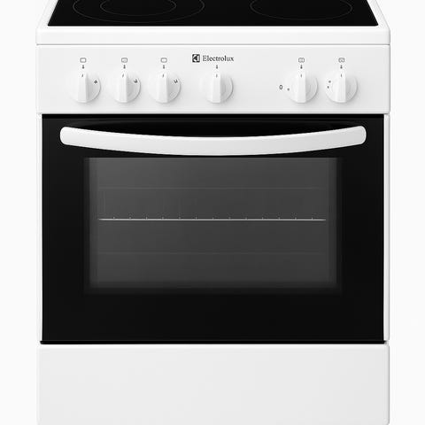 Electrolux keramisk komfyr med keramisk kokeplate og ovn med vifte. Komfyren har flere kokeplater med justerbare knotter for temperaturkontroll. Ovnen har flere rilleposisjoner for stekebrett og rist, samt innvendig belysning. Produktet er i hvit utførelse.