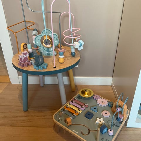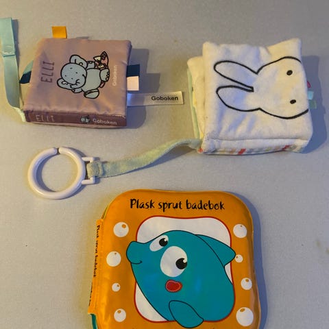2 babyleker. Et puttespill med lyder, en magnetisk leke som barnet kan trene finmotorikk. Begge fra Sprell