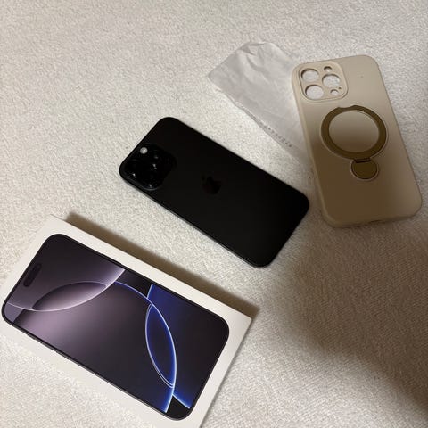 Apple iPhone 16 Pro Max med 512 GB lagringskapasitet. Mobilen har en lys farge med tre kameraer på baksiden. Leveres med original emballasje, ladekabel og ekstra deksel.