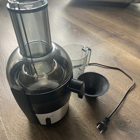 Philips Juicer i hvite og grå farger. Egnet for å lage juice fra frukt og grønnsaker. Utstyrt med en påfyllingsrør og en beholder for juice. Kompakt design for enkel bruk og rengjøring.