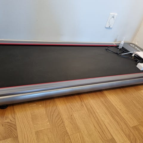 Frontier tredemølle med digitalt display og kontrollpanel. Utstyrt med håndtak for støtte og sikkerhet under trening. Passer til innendørs bruk for gå- og løpetrening.