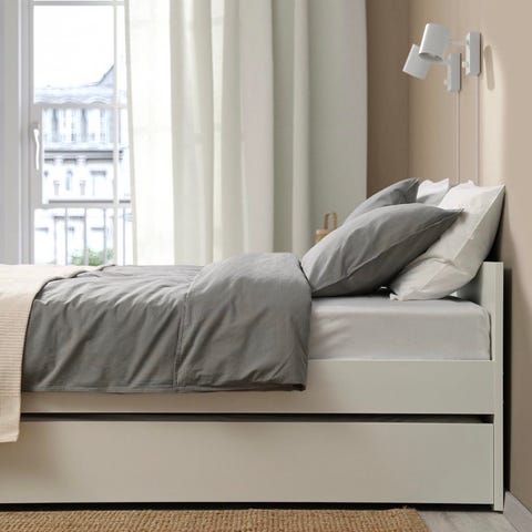 Jeg har hatt stor glede av den, er masse plass under. Den er enkel å løfte og holder seg oppe av seg selv. Selger siden jeg skal flytte.