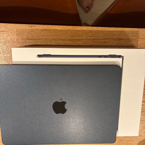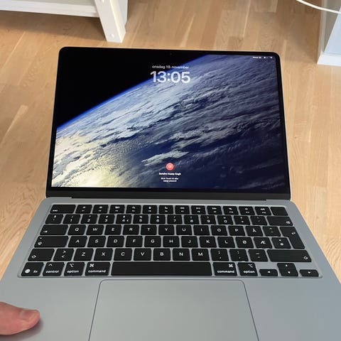 Apple MacBook Air 13" PC med M4 chip. Enheten har en svart beskyttelsesveske og skjerm med oppløsning som vist på bildene. Batteristatus viser 100% kapasitet med 10 sykluser registrert. Selges grunnet blir ikke brukt så mye, kjøpt i april 2025