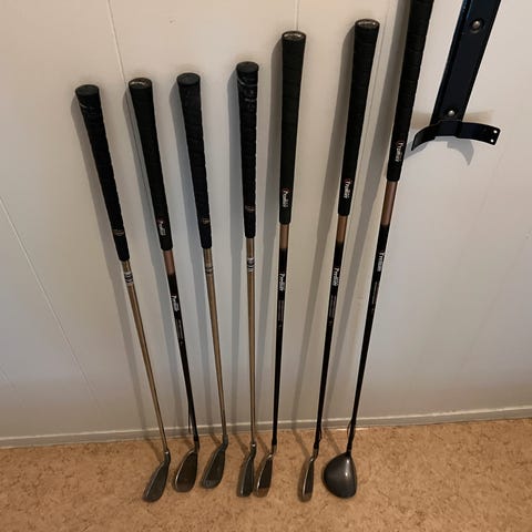 Honma 3 golfkøller sett med bag. Inkluderer flere køller med ulike nummer og en stående golfbag. Køllene har metallhoder og skaft, egnet for golfspillere.
